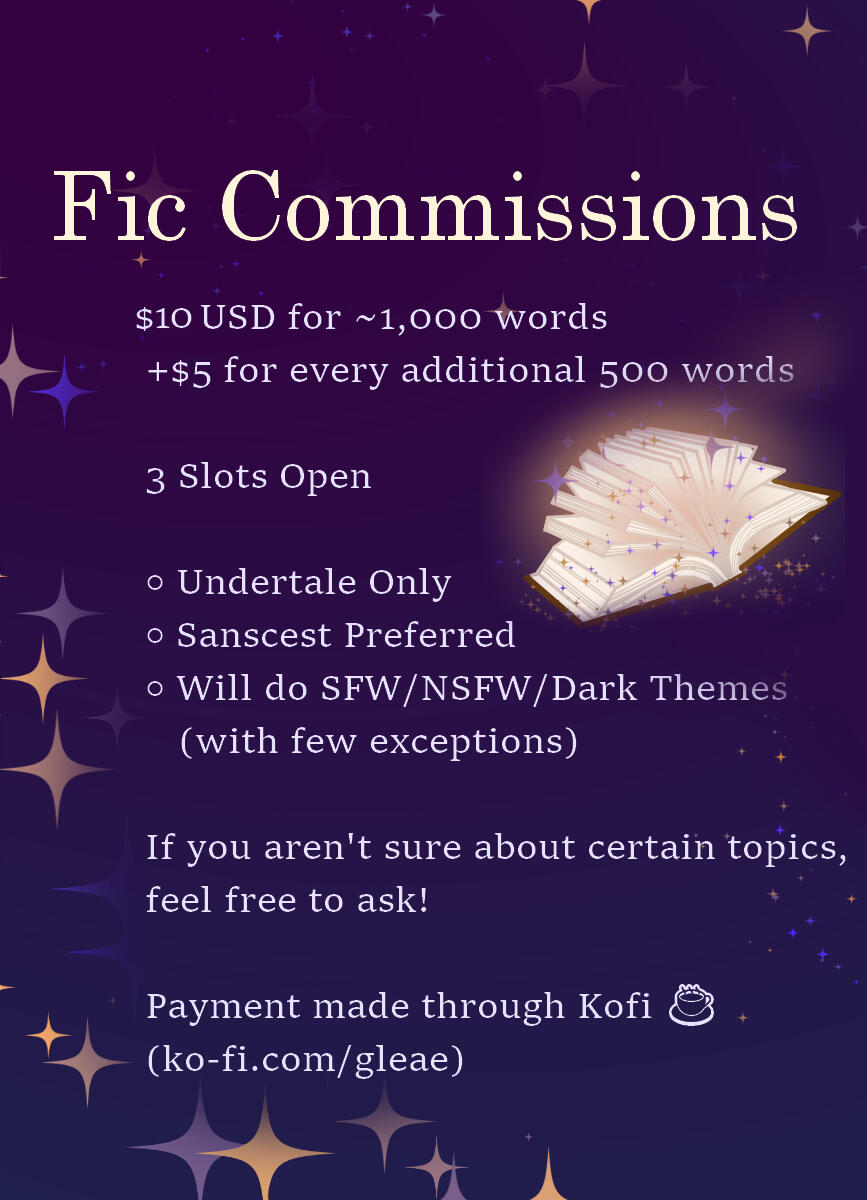 Feel free to DM me on any of my socials if you're interested in a Commission!Price/Word Count can be negotiated before hand or after a fic is completed. Payments are made after I complete the fic and share it to you (as a Google doc link, .docx/pdf file, Ao3 link, etc.)